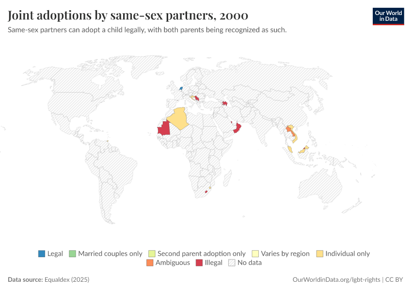 “Data Page: Joint adoptions by same-sex partners”, part of the following publication: Bastian Herre and Pablo Arriagada (2023) - “LGBT+ Rights”. Data adapted from Equaldex. Retrieved from https://bespoke-viz-urb.owid.pages.dev:8789/20260304-094028/grapher/joint-adoptions-same-sex-partners-equaldex.html [online resource] (archived on March 4, 2026).How to cite this data