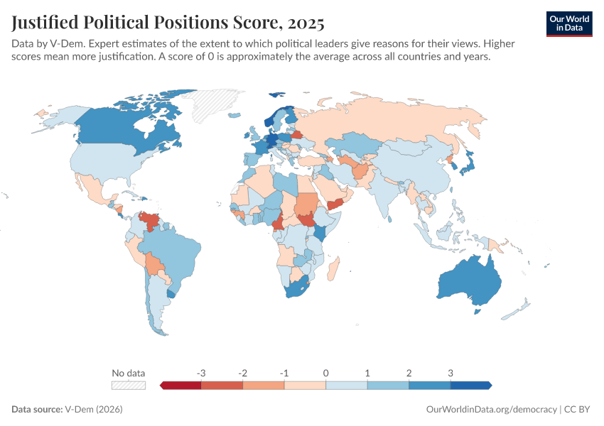 “Data Page: Justified political positions”, part of the following publication: Bastian Herre, Lucas Rodés-Guirao, and Esteban Ortiz-Ospina (2013) - “Democracy”. Data adapted from V-Dem. Retrieved from https://bespoke-viz-urb.owid.pages.dev:8789/20260318-112846/grapher/justified-political-positions-score.html [online resource] (archived on March 18, 2026).How to cite this data