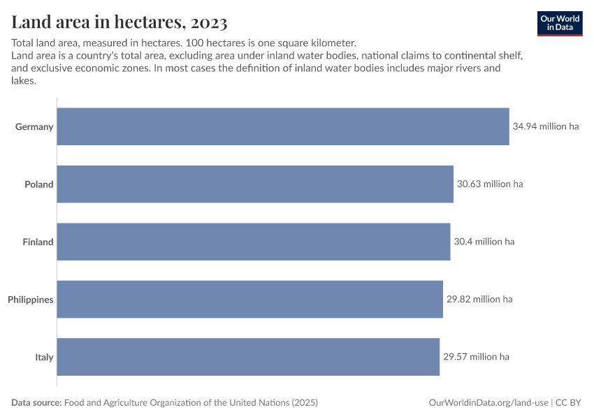 “Data Page: Land area in hectares”, part of the following publication: Hannah Ritchie, Pablo Rosado, and Max Roser (2023) - “Agricultural Production”. Data adapted from Food and Agriculture Organization of the United Nations. Retrieved from https://bespoke-viz-urb.owid.pages.dev:8789/20260304-094028/grapher/land-area-hectares.html [online resource] (archived on March 4, 2026).How to cite this data