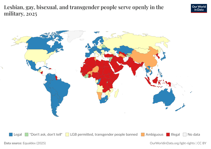 “Data Page: Lesbian, gay, bisexual, and transgender people serve openly in the military”, part of the following publication: Bastian Herre and Pablo Arriagada (2023) - “LGBT+ Rights”. Data adapted from Equaldex. Retrieved from https://bespoke-viz-urb.owid.pages.dev:8789/20260304-094028/grapher/lgbt-military-equaldex.html [online resource] (archived on March 4, 2026).How to cite this data