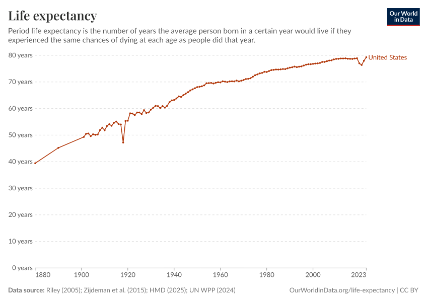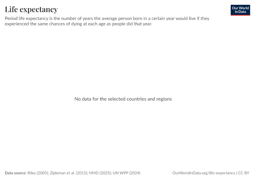 Riley (2005); Zijdeman et al. (2015); HMD (2025); UN WPP (2024) – with major processing by Our World in Data. “Life expectancy – Riley; Zijdeman et al.; HMD; UN WPP – Long-run data” [dataset]. Human Mortality Database, “Human Mortality Database”; United Nations, “World Population Prospects”; United Nations, “World Population Prospects - Interim Update”; Zijdeman et al., “Life Expectancy at birth v2”; James C. Riley, “Estimates of Regional and Global Life Expectancy, 1800-2001” [original data]. Retrieved April 11, 2026 from https://bespoke-viz-urb.owid.pages.dev:8789/20260304-094028/grapher/life-expectancy.html (archived on March 4, 2026).Download