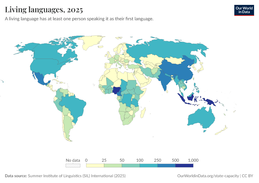 “Data Page: Living languages”, part of the following publication: Bastian Herre and Pablo Arriagada (2023) - “State Capacity”. Data adapted from Summer Institute of Linguistics (SIL) International. Retrieved from https://bespoke-viz-urb.owid.pages.dev:8789/20260325-171315/grapher/living-languages.html [online resource] (archived on March 25, 2026).How to cite this data