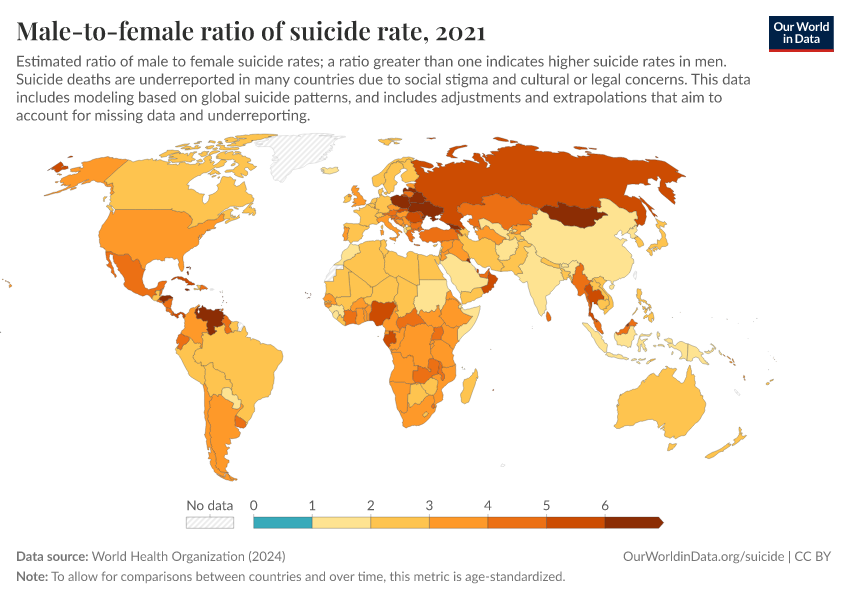 World Health Organization (2024) – with major processing by Our World in Data. “Male-to-female ratio of suicide rate” [dataset]. World Health Organization, “Global Health Estimates” [original data]. Retrieved April 11, 2026 from https://bespoke-viz-urb.owid.pages.dev:8789/20260325-171315/grapher/male-female-ratio-suicides-rates.html (archived on March 25, 2026).Download