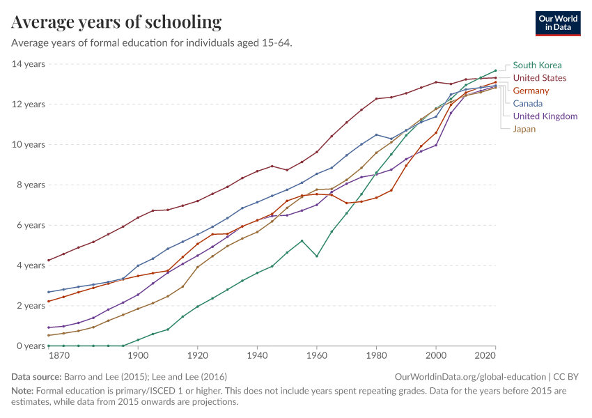 Barro and Lee (2015); Lee and Lee (2016) – with major processing by Our World in Data. “Average years of schooling” [dataset]. Barro and Lee, “Projections of Educational Attainment”; Lee and Lee, “Human Capital in the Long Run” [original data]. Retrieved April 11, 2026 from https://bespoke-viz-urb.owid.pages.dev:8789/20260304-094028/grapher/mean-years-of-schooling-long-run.html (archived on March 4, 2026).Download