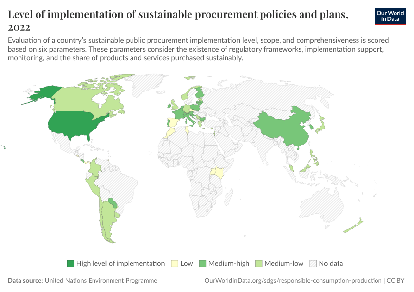 “Data Page: Level of implementation of sustainable procurement policies and plans”. Our World in Data (2026). Data adapted from United Nations Environment Programme. Retrieved from https://bespoke-viz-urb.owid.pages.dev:8789/20260304-094028/grapher/medium-high-level-implementation-of-sustainable-public-procurement.html [online resource] (archived on March 4, 2026).How to cite this data
