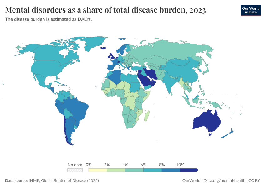 IHME, Global Burden of Disease (2025) – with major processing by Our World in Data. “Mental disorders as a share of total disease burden – IHME” [dataset]. IHME, Global Burden of Disease, “Global Burden of Disease - DALYs” [original data]. Retrieved April 11, 2026 from https://bespoke-viz-urb.owid.pages.dev:8789/20260319-180505/grapher/mental-and-substance-use-as-share-of-disease.html (archived on March 19, 2026).