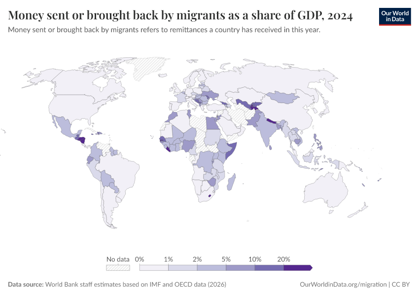 “Data Page: Money sent or brought back by migrants as a share of GDP”. Our World in Data (2026). Data adapted from World Bank staff estimates based on IMF and OECD data. Retrieved from https://bespoke-viz-urb.owid.pages.dev:8789/20260304-094028/grapher/money-sent-or-brought-back-by-migrants-as-a-share-of-gdp.html [online resource] (archived on March 4, 2026).How to cite this data