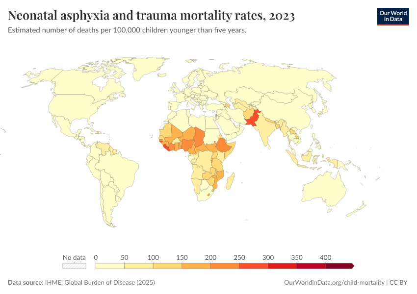 IHME, Global Burden of Disease (2025) – with major processing by Our World in Data. “Neonatal asphyxia and trauma mortality rates – IHME” [dataset]. IHME, Global Burden of Disease, “Global Burden of Disease - Deaths” [original data]. Retrieved April 11, 2026 from https://bespoke-viz-urb.owid.pages.dev:8789/20260323-161325/grapher/mortality-neonatal-asphyxia-and-trauma.html (archived on March 23, 2026).