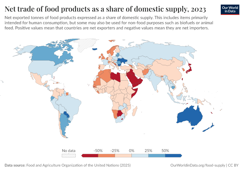 “Data Page: Net trade of food products as a share of domestic supply”, part of the following publication: Hannah Ritchie, Pablo Rosado, and Max Roser (2023) - “Agricultural Production”. Data adapted from Food and Agriculture Organization of the United Nations. Retrieved from https://bespoke-viz-urb.owid.pages.dev:8789/20260304-094028/grapher/net-food-trade-as-a-share-of-domestic-supply.html [online resource] (archived on March 4, 2026).How to cite this data