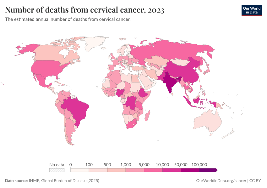 “Data Page: Number of deaths from cervical cancer”, part of the following publication: Esteban Ortiz-Ospina and Max Roser (2016) - “Global Health”. Data adapted from IHME, Global Burden of Disease. Retrieved from https://bespoke-viz-urb.owid.pages.dev:8789/20260323-160356/grapher/number-of-deaths-from-cervical-cancer.html [online resource] (archived on March 23, 2026).How to cite this data