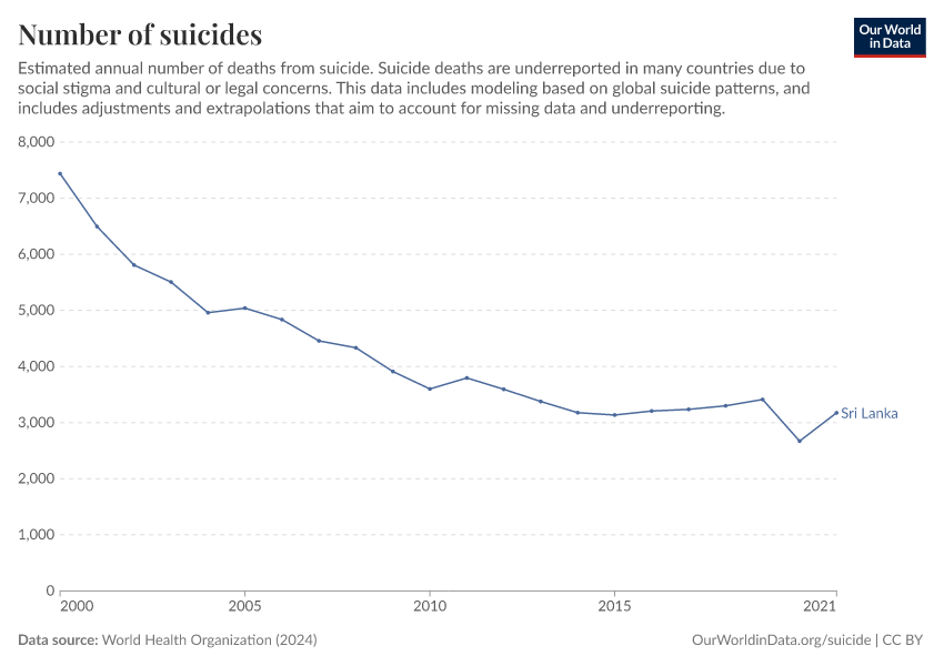 “Data Page: Number of suicides”, part of the following publication: Esteban Ortiz-Ospina and Max Roser (2016) - “Global Health”. Data adapted from World Health Organization. Retrieved from https://bespoke-viz-urb.owid.pages.dev:8789/20260325-171315/grapher/number-of-deaths-from-suicide-ghe.html [online resource] (archived on March 25, 2026).