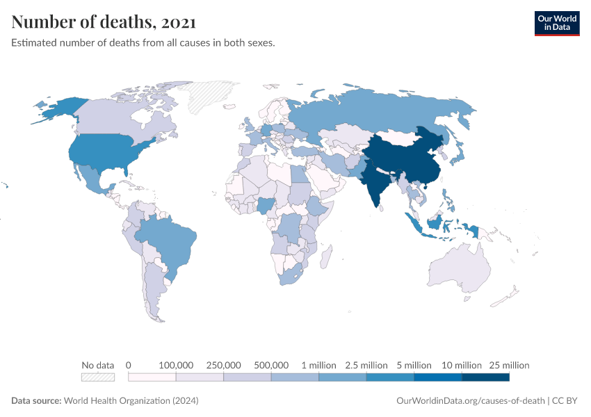 “Data Page: Number of deaths”, part of the following publication: Esteban Ortiz-Ospina and Max Roser (2016) - “Global Health”. Data adapted from World Health Organization. Retrieved from https://bespoke-viz-urb.owid.pages.dev:8789/20260325-171315/grapher/number-of-deaths-who.html [online resource] (archived on March 25, 2026).How to cite this data