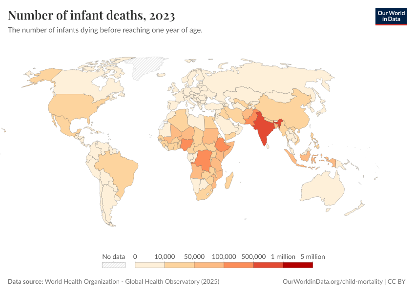 “Data Page: Number of infant deaths”. Our World in Data (2026). Data adapted from World Health Organization. Retrieved from https://bespoke-viz-urb.owid.pages.dev:8789/20260304-094028/grapher/number-of-infant-deaths-gho.html [online resource] (archived on March 4, 2026).How to cite this data