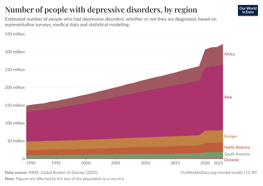 “Data Page: Number of people with depressive disorders, by region”, part of the following publication: Saloni Dattani, Lucas Rodés-Guirao, Hannah Ritchie, and Max Roser (2023) - “Mental Health”. Data adapted from IHME, Global Burden of Disease. Retrieved from https://bespoke-viz-urb.owid.pages.dev:8789/20260319-181852/grapher/number-suffering-from-depression-by-region.html [online resource] (archived on March 19, 2026).How to cite this data