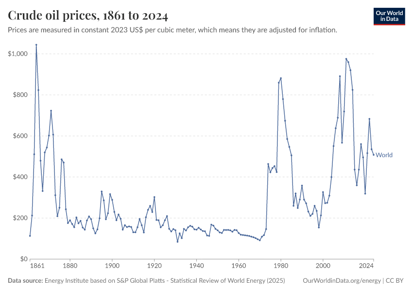 “Data Page: Oil price - Crude prices since 1861”, part of the following publication: Hannah Ritchie, Pablo Rosado, and Max Roser (2023) - “Energy”. Data adapted from Energy Institute. Retrieved from https://bespoke-viz-urb.owid.pages.dev:8789/20260304-094028/grapher/oil-prices-inflation-adjusted.html [online resource] (archived on March 4, 2026).How to cite this data