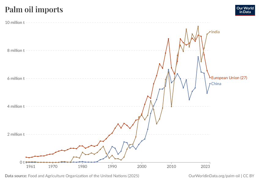 “Data Page: Imports of palm oil”. Our World in Data (2026). Data adapted from Food and Agriculture Organization of the United Nations. Retrieved from https://bespoke-viz-urb.owid.pages.dev:8789/20260304-094028/grapher/palm-oil-imports.html [online resource] (archived on March 4, 2026).How to cite this data