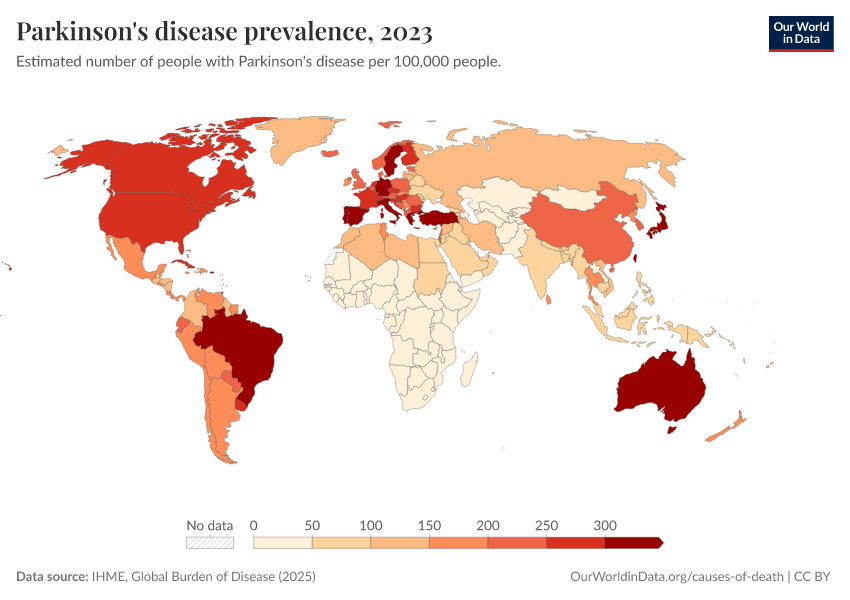 IHME, Global Burden of Disease (2025) – with major processing by Our World in Data. “Parkinson's disease prevalence – IHME” [dataset]. IHME, Global Burden of Disease, “Global Burden of Disease - Prevalence and Incidence” [original data]. Retrieved April 11, 2026 from https://bespoke-viz-urb.owid.pages.dev:8789/20260319-181852/grapher/parkinsons-disease-prevalence-ihme.html (archived on March 19, 2026).