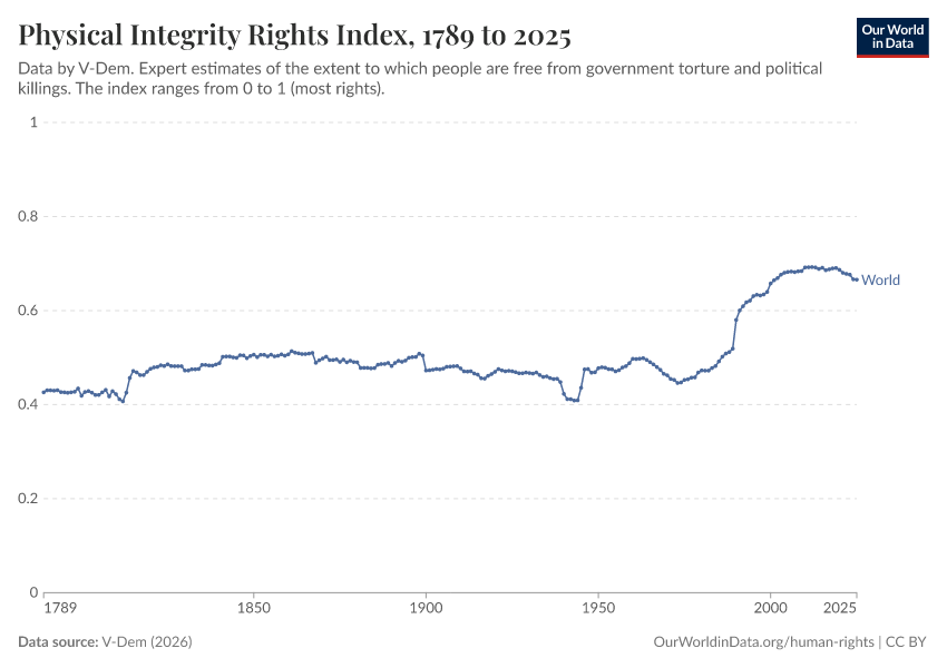 “Data Page: Physical violence index”, part of the following publication: Bastian Herre, Lucas Rodés-Guirao, and Esteban Ortiz-Ospina (2013) - “Democracy”. Data adapted from V-Dem. Retrieved from https://bespoke-viz-urb.owid.pages.dev:8789/20260325-171315/grapher/physical-integrity-rights-index-vdem.html [online resource] (archived on March 25, 2026).