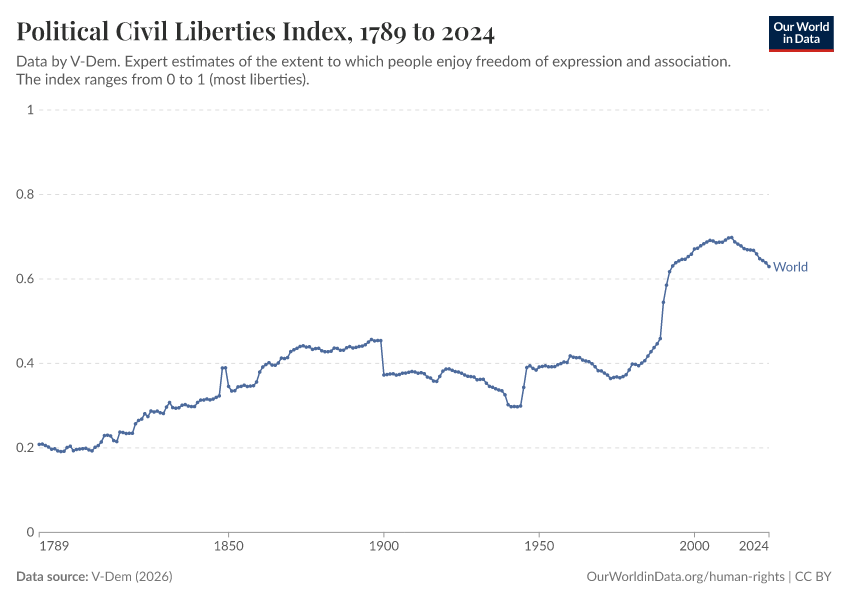 “Data Page: Political civil liberties index”, part of the following publication: Bastian Herre, Lucas Rodés-Guirao, and Esteban Ortiz-Ospina (2013) - “Democracy”. Data adapted from V-Dem. Retrieved from https://bespoke-viz-urb.owid.pages.dev:8789/20260325-171315/grapher/political-civil-liberties-index.html [online resource] (archived on March 25, 2026).