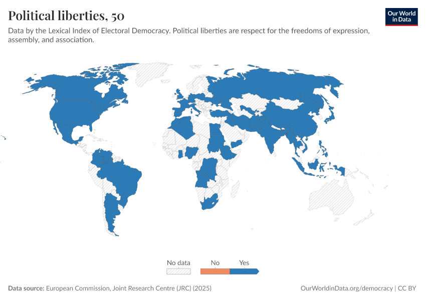 “Data Page: Political liberties”, part of the following publication: Bastian Herre, Lucas Rodés-Guirao, and Esteban Ortiz-Ospina (2013) - “Democracy”. Data adapted from Skaaning et al.. Retrieved from https://bespoke-viz-urb.owid.pages.dev:8789/20260304-094028/grapher/political-liberties-lexical.html [online resource] (archived on March 4, 2026).How to cite this data