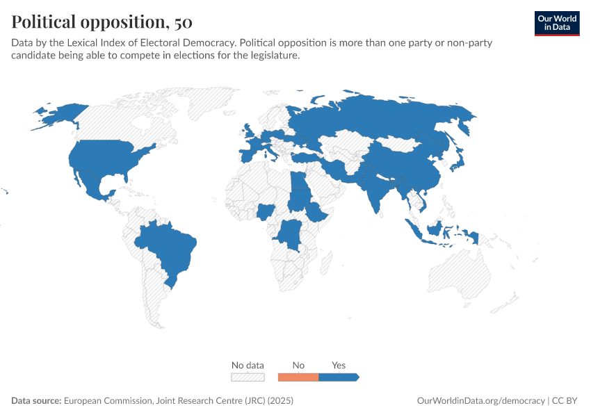Skaaning et al. (2025) – processed by Our World in Data. “Political opposition” [dataset]. Skaaning et al., “Lexical Index of Electoral Democracy (LIED) v6.8” [original data]. Retrieved April 11, 2026 from https://bespoke-viz-urb.owid.pages.dev:8789/20260318-101336/grapher/political-opposition-lexical.html (archived on March 18, 2026).Download