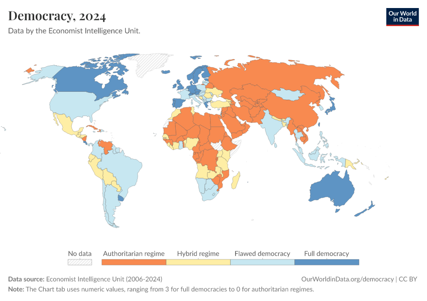 Economist Intelligence Unit (2006-2024) – processed by Our World in Data. “Democracy” [dataset]. Economist Intelligence Unit, “Democracy Index 2021: The China challenge”; Economist Intelligence Unit, “Democracy Index 2022: Frontline democracy and the battle for Ukraine”; Economist Intelligence Unit, “Democracy Index 2023: Age of Conflict”; Economist Intelligence Unit, “Democracy Index 2024: What's wrong with representative democracy?”; Gapminder, “Democracy Index v4” [original data]. Retrieved April 11, 2026 from https://bespoke-viz-urb.owid.pages.dev:8789/20260304-094028/grapher/political-regime-eiu.html (archived on March 4, 2026).Download