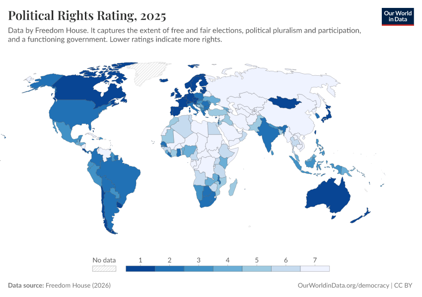 Freedom House (2026) – processed by Our World in Data. “Political Rights Rating” [dataset]. Freedom House, “Freedom in the World” [original data]. Retrieved April 11, 2026 from https://bespoke-viz-urb.owid.pages.dev:8789/20260324-084706/grapher/political-rights-rating-fh.html (archived on March 24, 2026).Download