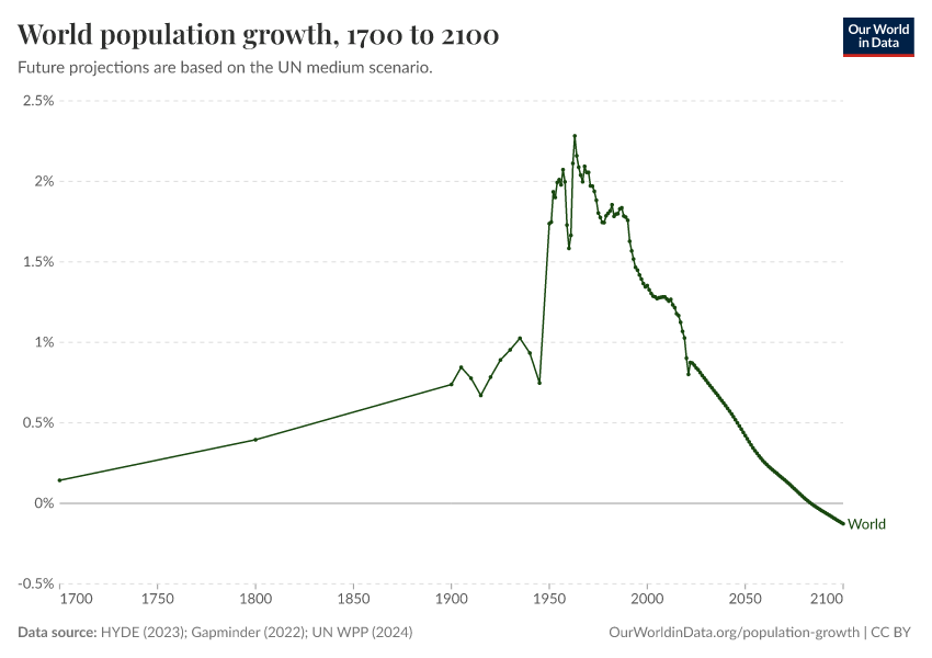 “Data Page: World population growth”, part of the following publication: Hannah Ritchie, Lucas Rodés-Guirao, Edouard Mathieu, Marcel Gerber, Esteban Ortiz-Ospina, Joe Hasell, and Max Roser (2023) - “Population Growth”. Data adapted from PBL Netherlands Environmental Assessment Agency, Gapminder, United Nations. Retrieved from https://bespoke-viz-urb.owid.pages.dev:8789/20260304-094028/grapher/population-growth-rate.html [online resource] (archived on March 4, 2026).How to cite this data