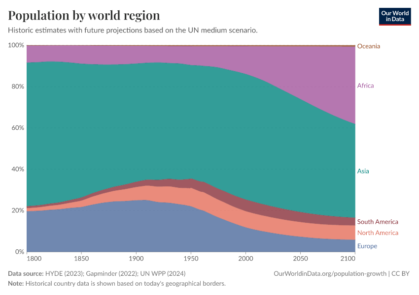 HYDE (2023); Gapminder (2022); UN WPP (2024) – with major processing by Our World in Data. “Population by world region” [dataset]. PBL Netherlands Environmental Assessment Agency, “History Database of the Global Environment 3.3”; Gapminder, “Population v7”; United Nations, “World Population Prospects”; United Nations, “World Population Prospects - Interim Update”; Gapminder, “Systema Globalis” [original data]. Retrieved April 11, 2026 from https://bespoke-viz-urb.owid.pages.dev:8789/20260304-094028/grapher/population-regions-with-projections.html (archived on March 4, 2026).Download