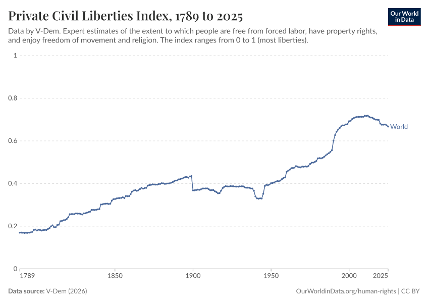 “Data Page: Private civil liberties index”, part of the following publication: Bastian Herre, Lucas Rodés-Guirao, and Esteban Ortiz-Ospina (2013) - “Democracy”. Data adapted from V-Dem. Retrieved from https://bespoke-viz-urb.owid.pages.dev:8789/20260325-171315/grapher/private-civil-liberties-index.html [online resource] (archived on March 25, 2026).How to cite this data