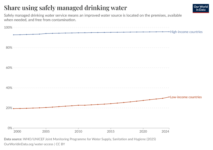 WHO/UNICEF Joint Monitoring Programme for Water Supply, Sanitation and Hygiene (2025) – processed by Our World in Data. “Share using safely managed drinking water” [dataset]. World Health Organization/UNICEF Joint Monitoring Programme for Water Supply, Sanitation and Hygiene, “WHO/UNICEF Joint Monitoring Programme for Water Supply, Sanitation and Hygiene (JMP) 2000-2024 report” [original data]. Retrieved April 11, 2026 from https://bespoke-viz-urb.owid.pages.dev:8789/20260304-094028/grapher/proportion-using-safely-managed-drinking-water.html (archived on March 4, 2026).