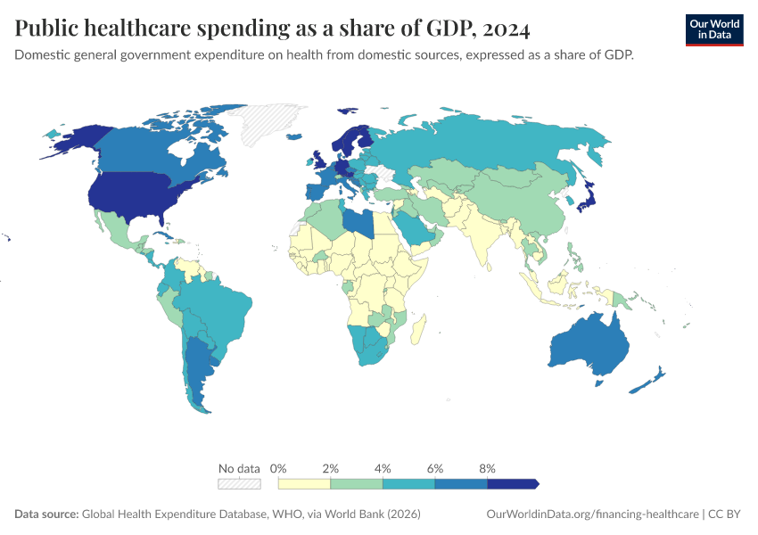 “Data Page: Public healthcare spending as a share of GDP”. Our World in Data (2026). Data adapted from Global Health Expenditure Database, WHO, via World Bank. Retrieved from https://bespoke-viz-urb.owid.pages.dev:8789/20260304-094028/grapher/public-healthcare-spending-share-gdp.html [online resource] (archived on March 4, 2026).How to cite this data