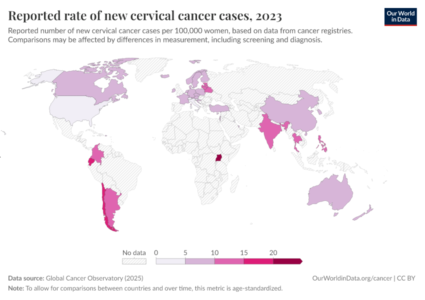 Global Cancer Observatory (2025) – processed by Our World in Data. “Reported rate of new cervical cancer cases” [dataset]. Global Cancer Observatory, “Cancer over time - Cervical cancer” [original data]. Retrieved April 11, 2026 from https://bespoke-viz-urb.owid.pages.dev:8789/20260304-094028/grapher/reported-rate-of-new-cervical-cancer-cases.html (archived on March 4, 2026).Download