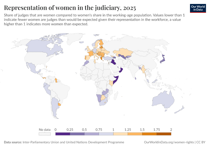 “Data Page: Representation of women in the judiciary”. Our World in Data (2026). Data adapted from Inter-Parliamentary Union and United Nations Development Programme. Retrieved from https://bespoke-viz-urb.owid.pages.dev:8789/20260304-094028/grapher/representation-of-women-in-the-judiciary.html [online resource] (archived on March 4, 2026).How to cite this data