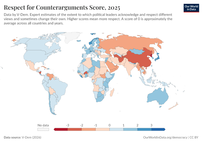 V-Dem (2026) – processed by Our World in Data. “Respect for counterarguments – V-Dem” [dataset]. V-Dem, “Democracy report v16” [original data]. Retrieved April 11, 2026 from https://bespoke-viz-urb.owid.pages.dev:8789/20260318-112846/grapher/respect-for-counterarguments-score.html (archived on March 18, 2026).Download
