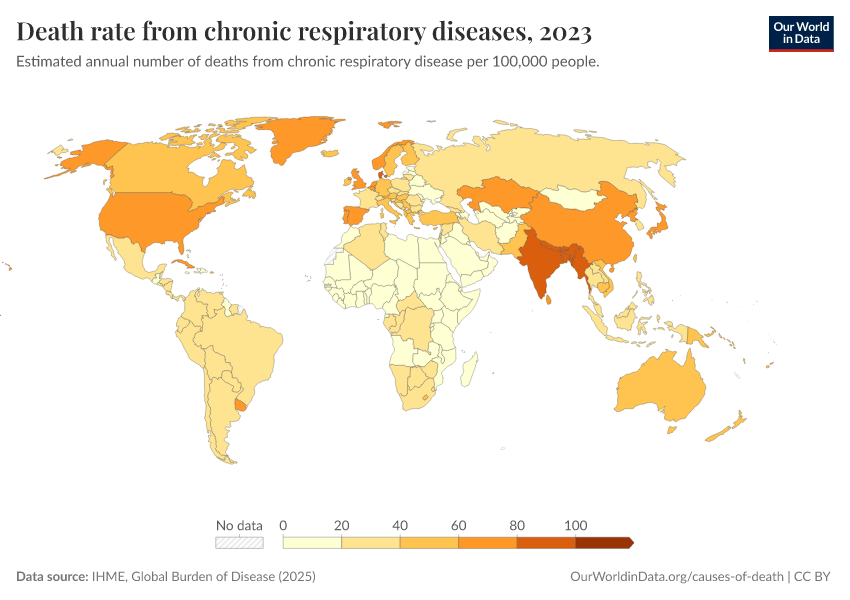 IHME, Global Burden of Disease (2025) – with major processing by Our World in Data. “Death rate from chronic respiratory diseases – IHME” [dataset]. IHME, Global Burden of Disease, “Global Burden of Disease - Deaths” [original data]. Retrieved April 11, 2026 from https://bespoke-viz-urb.owid.pages.dev:8789/20260323-161325/grapher/respiratory-disease-death-rate-gbd.html (archived on March 23, 2026).