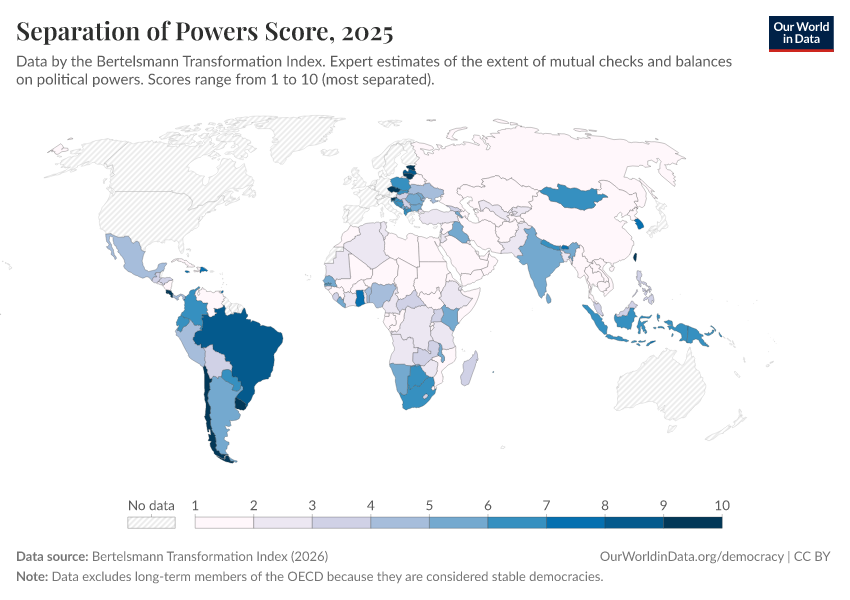 Bertelsmann Transformation Index (2026) – processed by Our World in Data. “Separation of Powers Score” [dataset]. Bertelsmann Transformation Index, “Bertelsmann Transformation Index, Scores” [original data]. Retrieved April 11, 2026 from https://bespoke-viz-urb.owid.pages.dev:8789/20260327-184752/grapher/separation-of-powers-score-bti.html (archived on March 27, 2026).Download