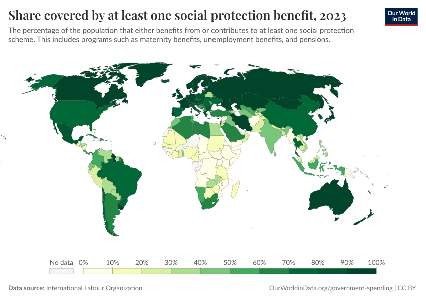 “Data Page: Share covered by at least one social protection benefit”. Our World in Data (2026). Data adapted from International Labour Organization. Retrieved from https://bespoke-viz-urb.owid.pages.dev:8789/20260304-094028/grapher/share-covered-by-one-social-protection-benefit.html [online resource] (archived on March 4, 2026).How to cite this data