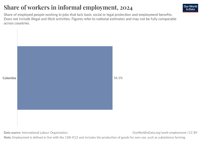 International Labour Organization – with major processing by Our World in Data. “Share of workers in informal employment” [dataset]. International Labour Organization, “Data from multiple sources” [original data]. Retrieved April 11, 2026 from https://bespoke-viz-urb.owid.pages.dev:8789/20260325-171315/grapher/share-in-informal-employment.html (archived on March 25, 2026).