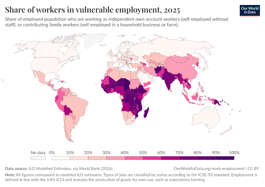 ILO Modelled Estimates, via World Bank (2026) – processed by Our World in Data. “Share of workers in vulnerable employment – ILO” [dataset]. ILO Modelled Estimates, via World Bank, “World Development Indicators 125” [original data]. Retrieved April 11, 2026 from https://bespoke-viz-urb.owid.pages.dev:8789/20260304-094028/grapher/share-in-vulnerable-employment.html (archived on March 4, 2026).Download