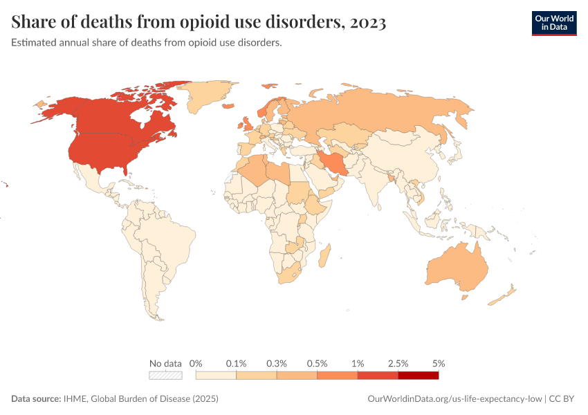 IHME, Global Burden of Disease (2025) – with major processing by Our World in Data. “Share of deaths from opioid use disorders – IHME” [dataset]. IHME, Global Burden of Disease, “Global Burden of Disease - Deaths” [original data]. Retrieved April 11, 2026 from https://bespoke-viz-urb.owid.pages.dev:8789/20260323-161325/grapher/share-of-deaths-from-opioid-overdoses.html (archived on March 23, 2026).