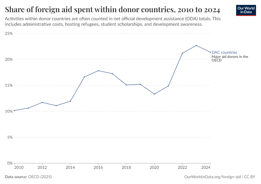 OECD (2025) – with minor processing by Our World in Data. “Share of foreign aid spent within donor countries – Net disbursements” [dataset]. OECD, “OECD Official Development Assistance (ODA) - DAC1: Flows by provider (ODA+OOF+Private)” [original data]. Retrieved April 11, 2026 from https://bespoke-viz-urb.owid.pages.dev:8789/20260304-094028/grapher/share-of-foreign-aid-spent-within-donor-countries.html (archived on March 4, 2026).Download