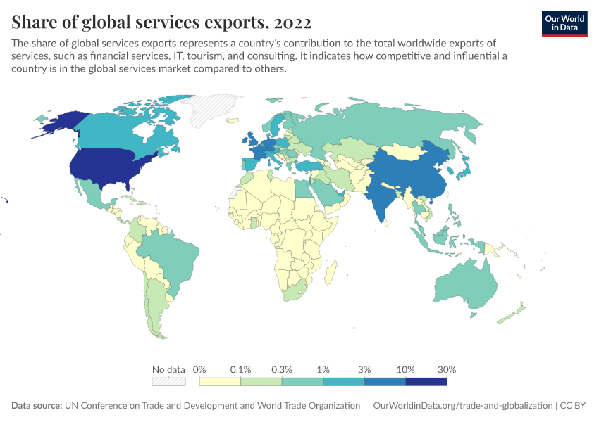 “Data Page: Share of global services exports”. Our World in Data (2026). Data adapted from UN Conference on Trade and Development and World Trade Organization. Retrieved from https://bespoke-viz-urb.owid.pages.dev:8789/20260304-094028/grapher/share-of-global-services-exports.html [online resource] (archived on March 4, 2026).How to cite this data