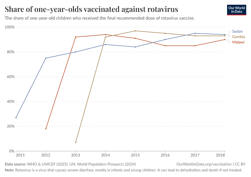 “Data Page: Share of one-year-olds vaccinated against rotavirus”, part of the following publication: Fiona Spooner, Saloni Dattani, Samantha Vanderslott, and Max Roser (2022) - “Vaccination”. Data adapted from WHO & UNICEF, United Nations. Retrieved from https://bespoke-viz-urb.owid.pages.dev:8789/20260304-094028/grapher/share-of-one-year-olds-who-received-the-rotavirus-vaccine.html [online resource] (archived on March 4, 2026).How to cite this data