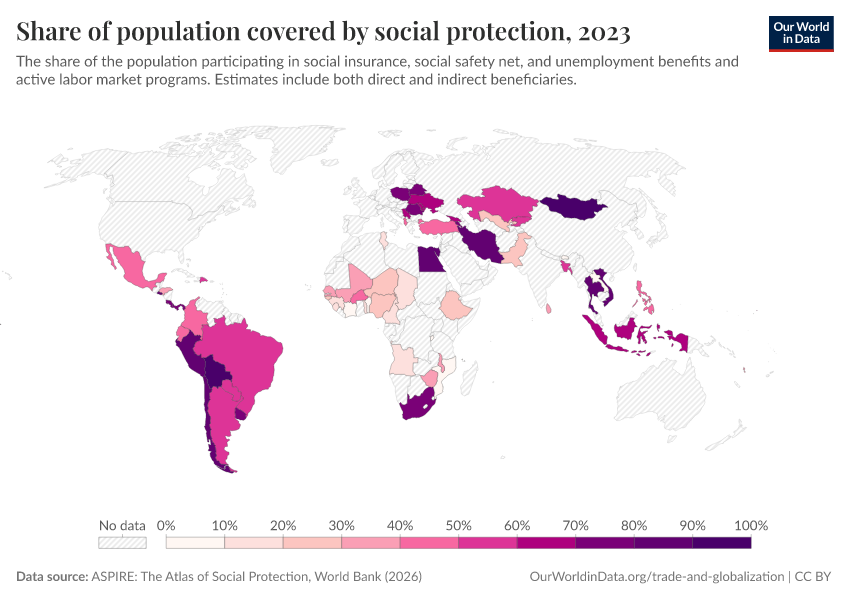 “Data Page: Share of population covered by social protection”. Our World in Data (2026). Data adapted from ASPIRE: The Atlas of Social Protection, World Bank. Retrieved from https://bespoke-viz-urb.owid.pages.dev:8789/20260304-094028/grapher/share-of-population-covered-by-social-protection.html [online resource] (archived on March 4, 2026).How to cite this data
