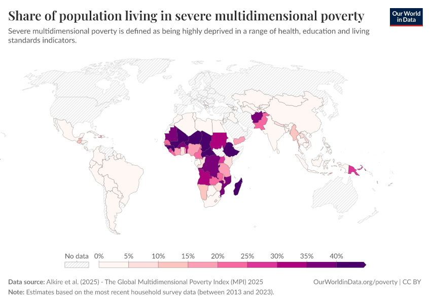 “Data Page: Share of population living in severe multidimensional poverty”, part of the following publication: Joe Hasell, Bertha Rohenkohl, Pablo Arriagada, Esteban Ortiz-Ospina, and Max Roser (2022) - “Poverty”. Data adapted from Alkire et al.. Retrieved from https://bespoke-viz-urb.owid.pages.dev:8789/20260325-171315/grapher/share-of-population-in-severe-multidimensional-poverty.html [online resource] (archived on March 25, 2026).How to cite this data