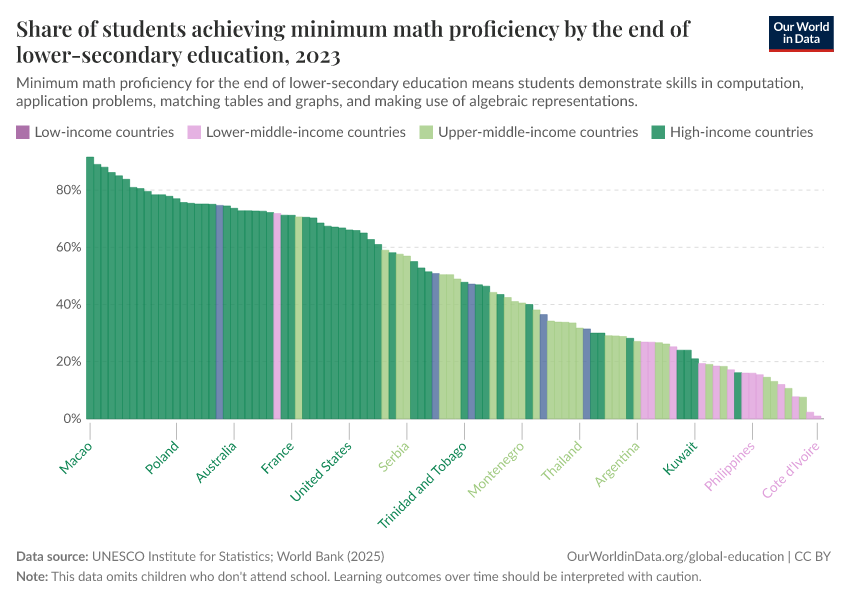 “Data Page: Share of students achieving minimum math proficiency by the end of lower-secondary education”. Our World in Data (2026). Data adapted from UNESCO Institute for Statistics. Retrieved from https://bespoke-viz-urb.owid.pages.dev:8789/20260304-094028/grapher/share-of-students-at-end-of-lower-secondary-education-achieving-minimum-math-proficiency.html [online resource] (archived on March 4, 2026).How to cite this data