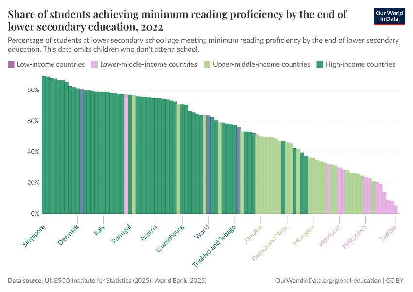 “Data Page: Share of students achieving minimum reading proficiency by the end of lower secondary education”, part of the following publication: Hannah Ritchie, Veronika Samborska, Esteban Ortiz-Ospina, and Max Roser (2023) - “Global Education”. Data adapted from UNESCO Institute for Statistics. Retrieved from https://bespoke-viz-urb.owid.pages.dev:8789/20260304-094028/grapher/share-of-students-at-end-of-lower-secondary-education-with-minimum-reading-proficiency.html [online resource] (archived on March 4, 2026).How to cite this data