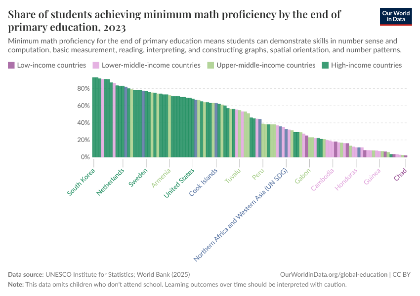 UNESCO Institute for Statistics – processed by Our World in Data. “Share of students achieving minimum math proficiency by the end of primary education” [dataset]. UNESCO Institute for Statistics, “Data from multiple sources” [original data]. Retrieved April 11, 2026 from https://bespoke-viz-urb.owid.pages.dev:8789/20260304-094028/grapher/share-of-students-at-end-of-primary-education-achieving-minimum-math-proficiency.html (archived on March 4, 2026).Download