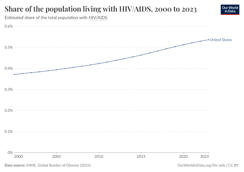 IHME, Global Burden of Disease (2025) – with major processing by Our World in Data. “Share of the population living with HIV/AIDS – IHME” [dataset]. IHME, Global Burden of Disease, “Global Burden of Disease - Prevalence and Incidence” [original data]. Retrieved April 11, 2026 from https://bespoke-viz-urb.owid.pages.dev:8789/20260319-181852/grapher/share-of-the-population-living-with-hivaids.html (archived on March 19, 2026).